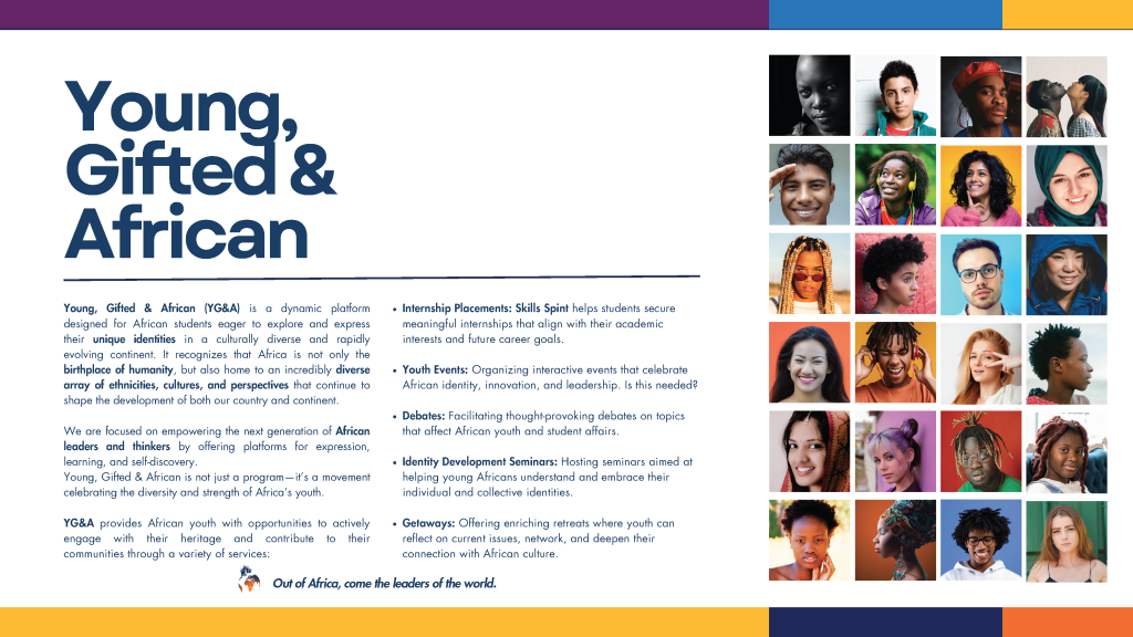 Young, Gifted & African (YG&A) is a dynamic platform designed for African students eager to explore and express their unique identities in a culturally diverse and rapidly evolving continent. It recognizes that Africa is not only the birthplace of humanity, but also home to an incredibly diverse array of ethnicities, cultures, and perspectives that continue to shape the development of both our country and continent.